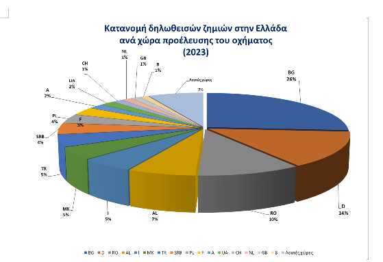 Την πρώτη θέση κατέχουν σταθερά τα ατυχήματα από οχήματα με Βουλγαρικές πινακίδες που ανήλθαν στα 1165 το 2023, (26,6% του συνόλου των ατυχημάτων). Ακολουθούν τα ατυχήματα από οχήματα με Γερμανικές πινακίδες που ανήλθαν σε 634 το 2023 (14,5% του συνόλου των ατυχημάτων) και τα ατυχήματα με Ρουμανικές πινακίδες που ανήλθαν σε 455 το 2023 (10,4% του συνόλου των ατυχημάτων).