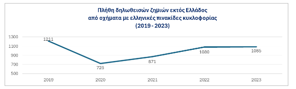 Όσον αφορά στα ατυχήματα που προκαλούνται από οχήματα με Ελληνικές πινακίδες στο εξωτερικό, παρατηρείται επίσης σταδιακή άνοδος. Έτσι για το 2023 ο αριθμός των ατυχημάτων στο εξωτερικό ανήλθε σε 1085 έναντι 1080 το 2022, παρουσιάζοντας αύξηση 0,5%.