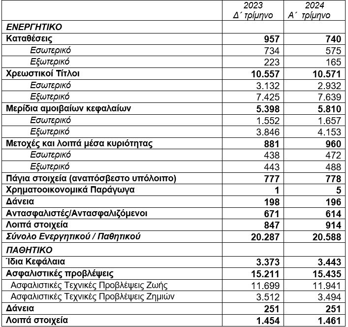 Η συνολική αξία του ενεργητικού των ασφαλιστικών επιχειρήσεων αυξήθηκε κατά 301 εκατ. ευρώ σε σχέση με το προηγούμενο τρίμηνο και διαμορφώθηκε στα 20.588 εκατ. ευρώ στο τέλος του α΄ τριμήνου του 2024.