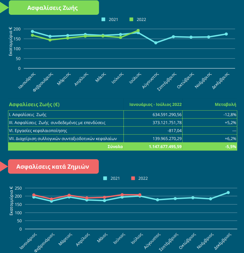 Την περίοδο Ιανουαρίου – Ιουλίου 2022 τα ασφάλιστρα αυξάνονται οριακά κατά 0,9% και οι ασφαλιστικές ειπράττουν 1,1 δις από ζωικές ασφαλίσεις και 1,39 δις από γενικές, δηλαδή συνολικά 2,5 δις ευρώ.