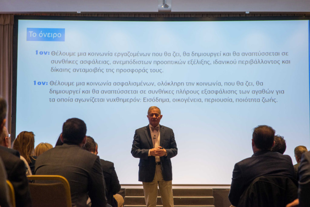 Στη συνέχεια ο Διευθύνων Σύμβουλος αναφέρθηκε – όπως κάθε χρόνο – στο κοινό όνειρο που όλοι στην Ευρωπαϊκή Πίστη έχουν συμφωνήσει. Που άλλοτε συνειδητά και άλλοτε ασυνείδητα υλοποιούν παρέα. Στην κοινωνία εργαζομένων που έχουν δημιουργήσει και αναπτύσσουν δημιουργώντας συνθήκες πλήρους ασφάλειας, ανεμπόδιστων προοπτικών εξέλιξης, μηδενικών φραγμών, συμπαθειών και οικογενειοκρατίας. Ενός ιδανικού περιβάλλοντος εργασίας και δίκαιης ανταμοιβής της προσφοράς.