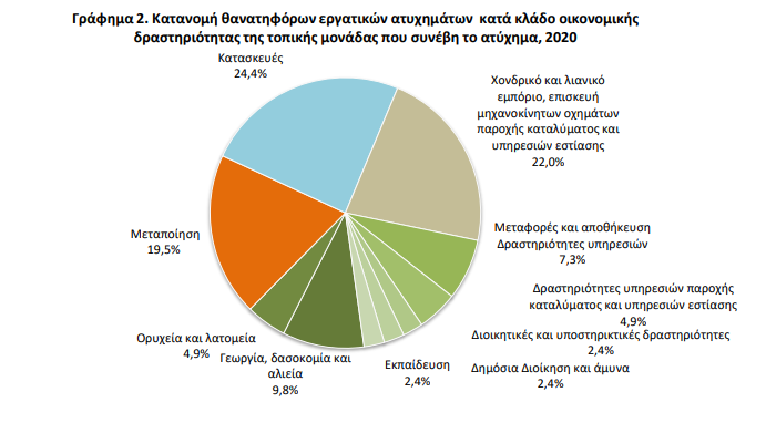 Από την κατανομή του συνόλου των εργατικών ατυχημάτων κατά κλάδο οικονομικής δραστηριότητας της τοπικής μονάδας του εργοδότη όπου συνέβη το ατύχημα, παρατηρήθηκε ότι κατά το έτος 2020, από τα 3.963 ατυχήματα, τα περισσότερα (1.093 ατυχήματα, 27,6%) συνέβησαν στον κλάδο Χονδρικού και Λιανικού Εμπορίου, Επισκευής Μηχανοκίνητων Οχημάτων και Μοτοσυκλετών και ακολούθησαν τα ατυχήματα στους κλάδους της Μεταποίησης (759 ατυχήματα, 19,2%) και στις Μεταφορές και Αποθήκευση (399 ατυχήματα, 10,1%). Αντίστοιχα, τα περισσότερα θανατηφόρα εργατικά ατυχήματα, κατά το έτος 2020 συνέβησαν στον κλάδο των Κατασκευών (10 ατυχήματα, 24,4%) και ακολούθησαν οι κλάδοι του Χονδρικού και Λιανικού Εμπορίου, Επισκευής Μηχανοκίνητων Οχημάτων και Μοτοσυκλετών (9 ατυχήματα, 22%) και της Μεταποίησης (8 ατυχήματα, 19,5%) .