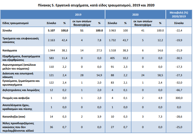 Σύμφωνα με τα στοιχεία που δημοσίευσε τον Ιούλιο η ΕΛΣΤΑΤ και αφορούν το 2020 στην χώρα μας καταγράφηκαν 3.963 εργατικά ατυχήματα από τα οποία τα 41 ήταν θανατηφόρα (38 άντρες και 3 γυναίκες).