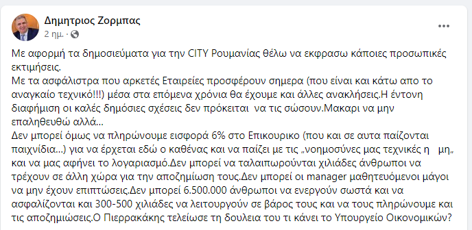 Σε λογαριασμό του στα μέσα κοινωνικής δικτύωσης εκφράζοντας την προσωπική του άποψη επισημαίνει ότι “με τα ασφάλιστρα που αρκετές Εταιρείες προσφέρουν σήμερα (που είναι και κάτω από το αναγκαίο τεχνικό!!!) μέσα στα επόμενα χρόνια θα έχουμε και άλλες ανακλήσεις. Η έντονη διαφήμιση οι καλές δημόσιες σχέσεις δεν πρόκειται να τις σώσουν. Μακάρι να μην επαληθευθώ αλλά… Δεν μπορεί όμως να πληρώνουμε εισφορά 6% στο Επικουρικό (που και σε αυτά παίζονται παιχνίδια…) για να έρχεται εδώ ο καθένας και να παίζει με τις νοημοσύνες μας τεχνικές η μη„ και να μας αφήνει το λογαριασμό.