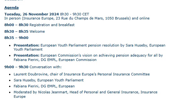 Στο πλαίσιο της Ευρωπαϊκής Εβδομάδας Συνταξιοδότησης, η Insurance Europe θα συγκεντρώσει στις 24 Νοεμβρίου ανθρώπους που θεωρούνται ηγετικές φυσιογνωμίες για τους νέους, εμπειρογνώμονες του κλάδου και υπεύθυνους χάραξης πολιτικής για να διερευνήσει τρόπους διασφάλισης της επάρκειας των συντάξεων και της βιωσιμότητας για όλες τις γενιές.