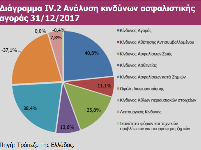 ν (ασφαλιστικές εταιρίες μικτής δραστηριότητας), η συνεισφορά των διαφόρων κινδύνων στο προφίλ των κινδύνων τους διαφοροποιείται σημαντικά. Ο μεγαλύτερος κίνδυνος είναι αυτός της αγοράς καθώς συνεισφέρει κατά 41,3% (από 41,8% το προηγούμενο έτος), ενώ οι ασφαλιστικοί κίνδυνοι κατά ζημιών, ζωής και ασθενείας συνεισφέρουν με ποσοστό 37,6%, 25,6% και 17,5% (τα ποσοστά αυτά βρίσκονται σε παρόμοιο επίπεδο με τα αντίστοιχα το προηγούμενο έτος) (Διάγραμμα IV.7). Επιπλέον, ο κίνδυνος αθέτησης αντισυμβαλλομένου κινείται σε υψηλά επίπεδα, αν και είναι μειωμένος σε σχέση με τα προηγούμενα έτη (περίπου 11,6%, από 12,5% το 2017 και 15% το 2016). Τα οφέλη από τη διαφοροποίηση είναι αρκετά σημαντικά (μειώνουν τον κίνδυνο κατά 41,6% περίπου), καθώς οι επιχειρήσεις αυτές έχουν μεγαλύτερες δυνατότητες ανάληψης ασυσχέτιστων ή και, σε ορισμένες περιπτώσεις, αρνητικά συσχετισμένων κινδύνων.