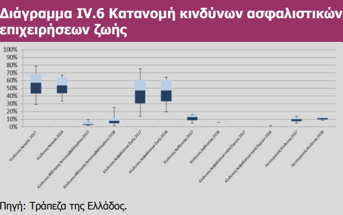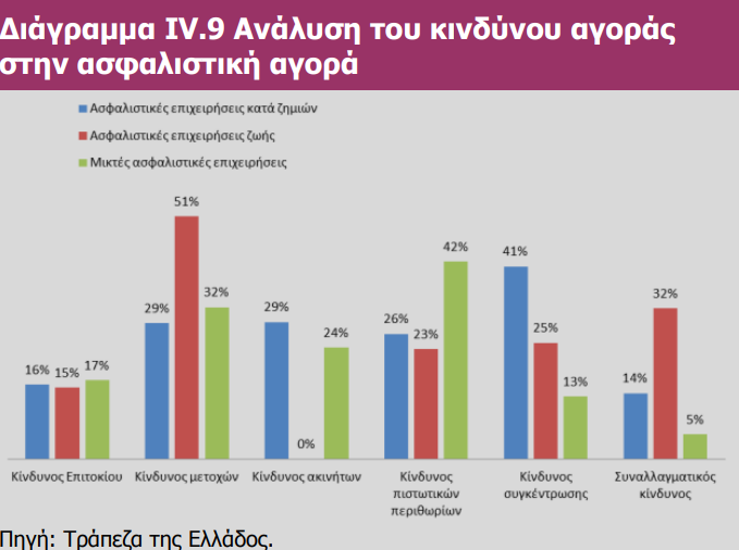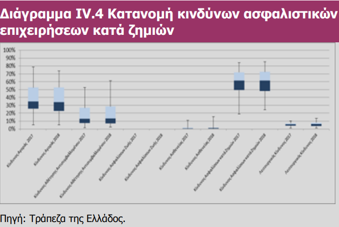 Ο κίνδυνος αγοράς αφορά κυρίως τους κινδύνους μετοχών και πιστωτικών περιθωρίων, ενώ ο ασφαλιστικός κίνδυνος αφορά κυρίως τον κίνδυνο ασφαλίσεων κατά ζημιών. Σημειώνεται ότι όλοι οι κίνδυνοι προέρχονται από την ανάλυση της καθαρής Κεφαλαιακής Απαίτησης Φερεγγυότητας των ασφαλιστικών επιχειρήσεων κατά το 2018, μετά την επίπτωση της αντασφάλισης, η οποία είναι σημαντική κυρίως για τους καταστροφικούς κινδύνους (κλάδοι πυρός-σεισμού).