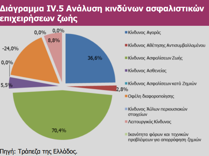 Στις τρεις ασφαλιστικές επιχειρήσεις που ασκούν αποκλειστικά ασφαλίσεις ζωής, ο μεγαλύτερος κίνδυνος είναι ο ασφαλιστικός, με ποσοστό περίπου 70,4% (παραμένοντας στα ίδια περίπου επίπεδα σε σχέση με το προηγούμενο έτος), ενώ ο αμέσως επόμενος κατά σειρά σημαντικότητας είναι κίνδυνος αγοράς με 36,6% (από 33,2% κατά το προηγούμενο έτος) (Διάγραμμα IV.5). Τόσο ο λειτουργικός κίνδυνος όσο και ο κίνδυνος αθέτησης αντισυμβαλλομένου παρουσιάζουν σχετική σταθερότητα σε σχέση με το προηγούμενο έτος (8,8% και 2,8% αντίστοιχα). Τα οφέλη από τη διαφοροποίηση των κινδύνων κινούνται σε παρόμοιο επίπεδο με των ασφαλιστικών κατά ζημιών (περίπου 24%).