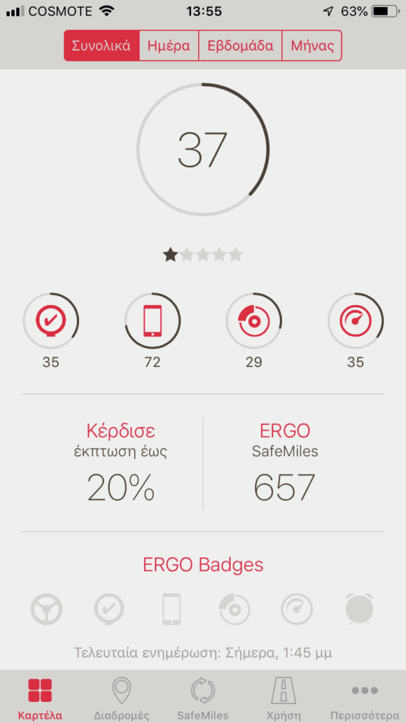 Η εφαρμογή λειτουργεί άψογα! Όχι μόνο έχει πολύ φιλικό user experience αλλά σε κρατάει και σε ενδιαφέρον. Θέλεις να οδηγάς καλύτερα μόνο και μόνο για να μη βλέπεις «τα χάλια σου» στον τελικό απολογισμό. Σε προσωπικό επίπεδο η ιδέα ότι μια εφαρμογή καταγράφει το πώς οδηγώ με έκανε να μην «ξεχνιέμαι» και να οδηγώ πιο συνετά. Τώρα ο στόχος είναι να βελτιώσω το σκορ μου και να πάω στο 68/100 που είναι και ο μέσος όρος. Συνολικά η εφαρμογή είναι διακριτική και δουλεύει με ακρίβεια. Σου δίνει μάλιστα extra κίνητρα στο να γίνεις καλύτερος οδηγός καθώς με τη συλλογή SafeMiles & ERGO Stars μπορείς να αποκτήσεις έκπτωση στα ασφάλιστρα του αυτοκινήτου σου (έως 20%) ή να κάνεις δωρεές για την προστασία του περιβάλλοντος αλλά και να συμμετέχεις σε διαγωνισμούς που δημιουργούνται κατά περιόδους.