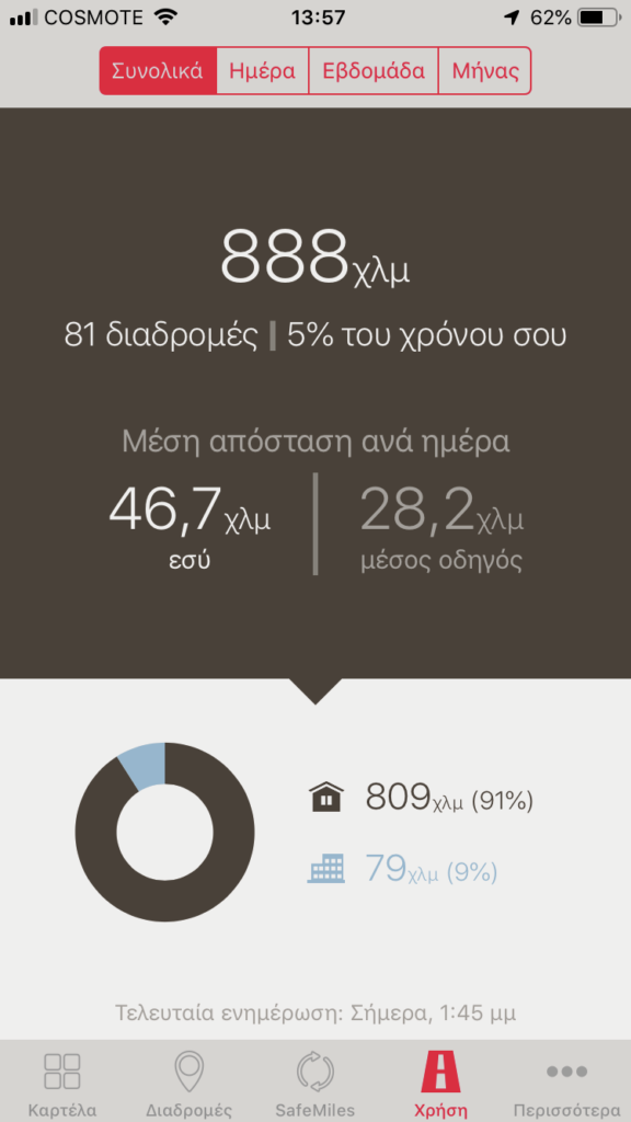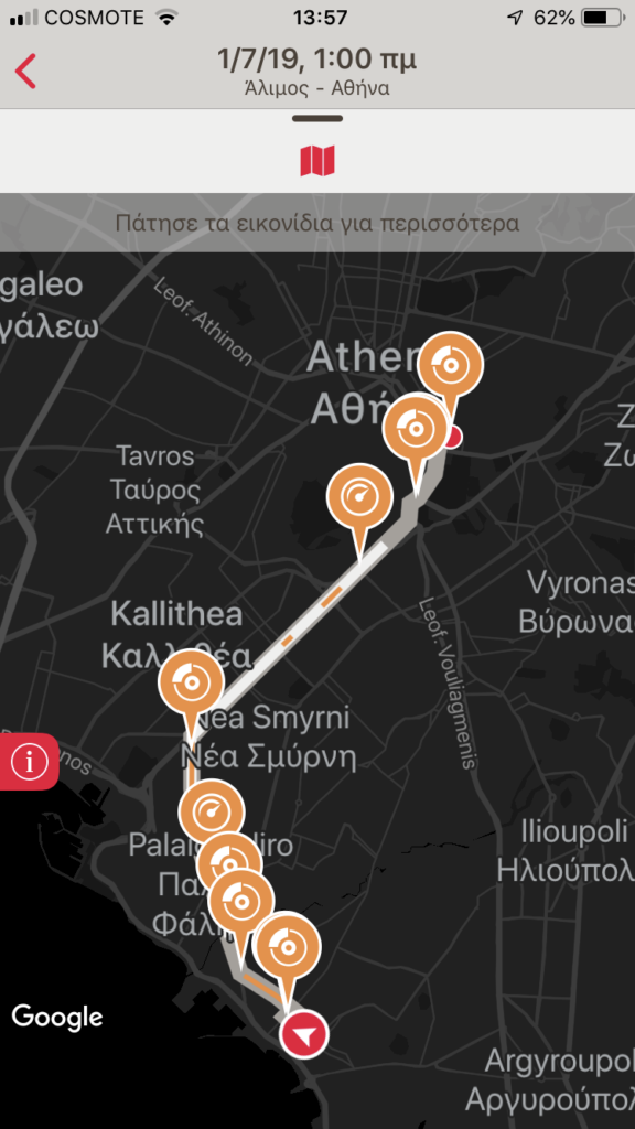 Αντιθέτως παρακολούθησα και τη διαδρομή που έκανα στις 5/7/2019 που ήταν η διαδρομή πηγαίνοντας πρωί στο γραφείο. Συμπλήρωσα 96 πόντους στην ταχύτητα, 20 πόντους στη μη χρήση κινητού (εδώ πρέπει να μάθουμε αν η χρήση του κινητού σε ανοιχτή ακρόαση μετράει το ίδιο με την κανονική χρήση), 59 πόντους στο φρενάρισμα με χαρακτηρισμό επιθετικότητας «χαμηλή» και 62 πόντους στην επιτάχυνση με χαρακτηρισμό επιθετικότητας «μεσαία». Σύνολο πόντων; 64/100. Μάλιστα η εφαρμογή έχει καταγράψει και πόσο χρόνο μίλησα στο κινητό (3.38’’) κάνοντάς μου και σχετική υπόδειξη «Είχες χαμηλό σκορ στη χρήση κινητού και χαμηλή επίδοση στα Α.Φ. (Απότομα Φρεναρίσματα). Μη χρησιμοποιείς το κινητό σου κατά την οδήγηση. Θα σε βοηθήσει να αποφύγεις τα Α.Φ. σε περίπτωση απρόοπτου γεγονότος».