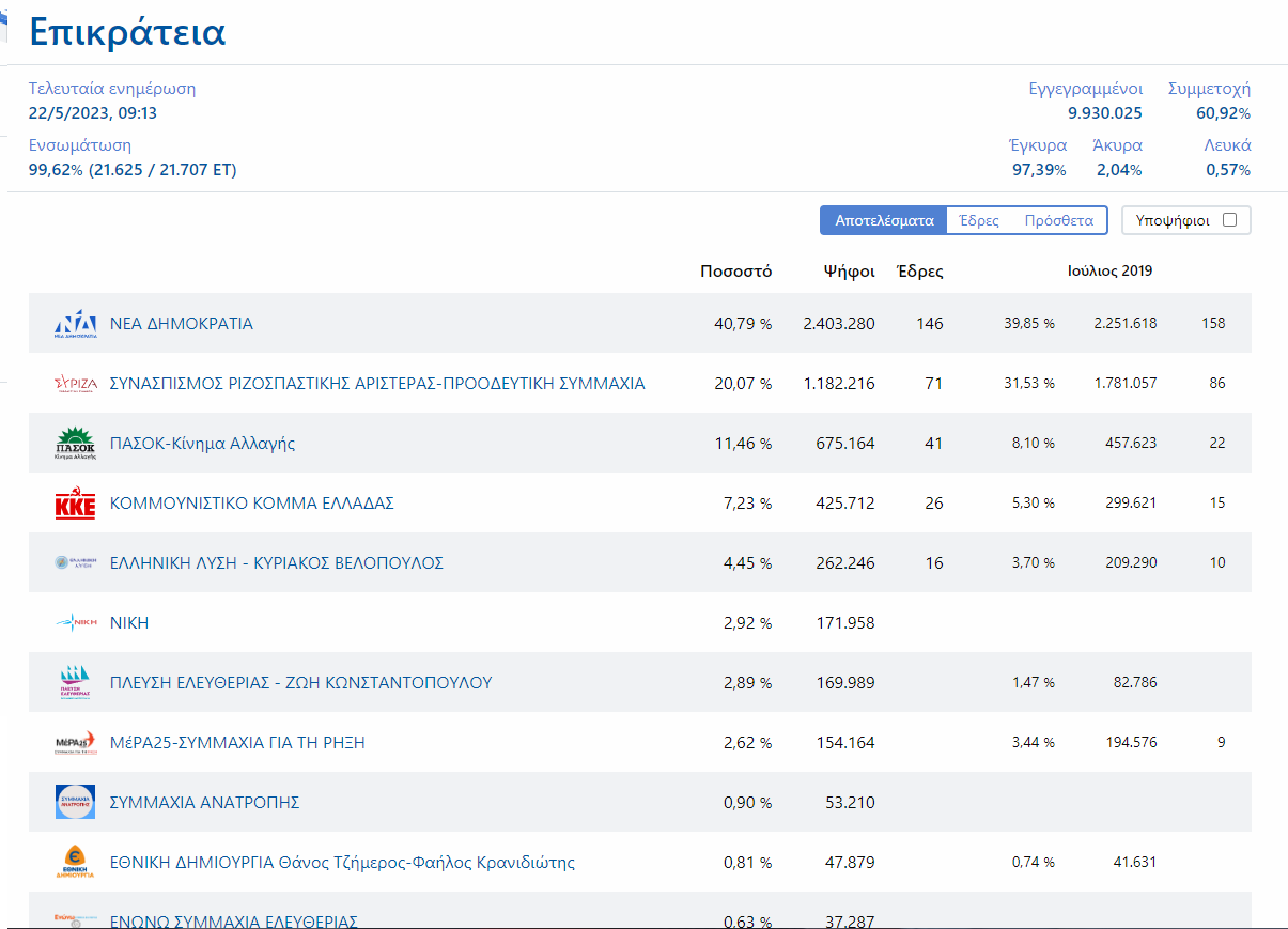 Με μεγάλο προβάδισμα για τη Νέα Δημοκρατία ολοκληρώθηκαν οι εκλογές της 21ης Μαΐου, καθώς το κόμμα του Κυριάκου Μητσοτάκη συγκέντρωσε ποσοστό 40,79% και εκλέγει 146 βουλευτές, ενώ ο ΣΥΡΙΖΑ με ποσοστό 20,07% βγάζει 71 βουλευτές.