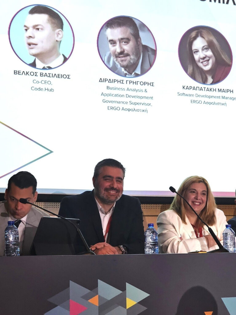 Ο Κωνσταντίνος Χατζησυμεών, Chief Information & Processes Transformation Officer συμμετείχε σε πάνελ με θέμα την αξιοποίηση της ανάλυσης δεδομένων και τις προκλήσεις που επιφέρει η τεχνητή νοημοσύνη στον κλάδο. Η Μαίρη Καραπατάκη, Software Development Manager και ο Γρηγόρης Διρδίρης, Business Analysis & Application Development Governance Supervisor, παρουσίασαν το case study του chatbot εξυπηρέτησης πελατών “Χαρά”, στη θεματική «Πώς υλοποιούνται μεγάλα έργα πληροφορικής και ποιες ειδικότητες συμμετέχουν;» φωτίζοντας την υλοποίηση μεγάλων έργων πληροφορικής και τις σχετικές απαραίτητες δεξιότητες.