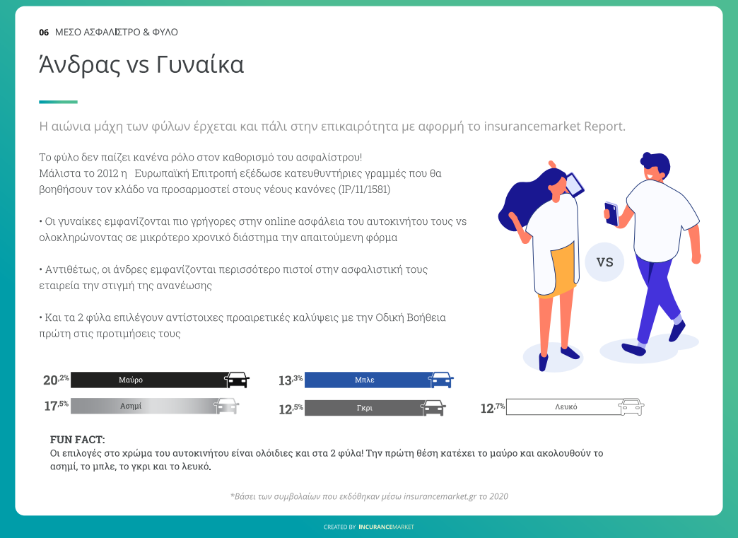 Το ποιο ακριβό ασφάλιστρο φαίνεται πως πληρώνουν όσοι είναι στην ηλικιακή κατηγορία 20-29 ετών και το φθηνότερο όσοι είναι 40-49 ετών. Το φύλο δεν παίζει ρόλο στη διαμόρφωση της τιμής ενώ οι άντρες είναι πιο πιστοί στην ασφαλιστική τους εταιρεία.