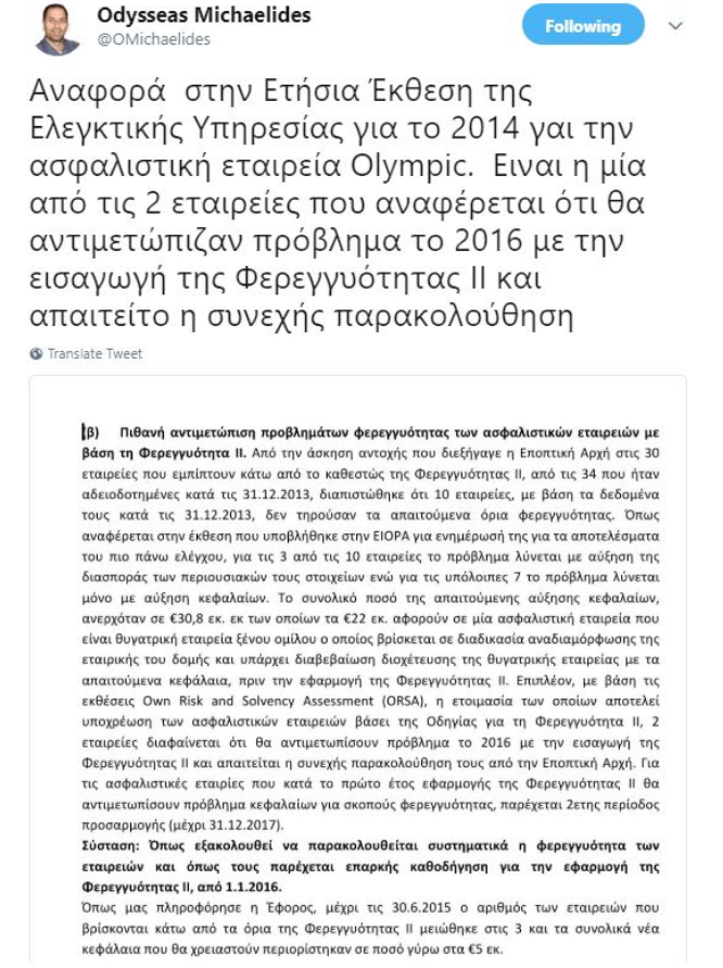 Σε παρέμβαση που έχει κάνει στο twitter o Οδυσσέας Μιχαηλίδης, Γενικός Ελεγκτής της Δημοκρατίας, αναφέρει ότι το 2015 στην Ετήσια Έκθεση της Ελεγκτικής Υπηρεσίας για το 2014, γινεται λόγος για 2 εταιρείες που θα αντιμετωπίσουν πρόβλημα με την φερεγγυότητα II και απαιτείται η συνεχής παρακολούθησή τους από την εποπτική αρχή.
