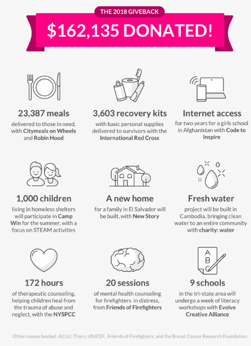 Το 2018 η Lemonade επέστρεψε 162,135 δολάρια στην κοινωνία, φτιάχνοντας μεταξύ άλλων ένα σπίτι για μία οικογένεια στο El Salvador, παρέχοντας σε 1.000 παιδιά που ζουν σε καταφύγια αστέγων διακοπές σε κατασκήνωση, δίνοντας 23.387 γεύματα σε ανθρώπους που βρίσκονται σε δυσχερή θέση, προσέφεραν 172 ώρες θεραπευτικής αγωγής σε παιδιά που έχουν υποστεί τραύμα από κακοποίηση, έδωσαν 3.603 κουτιά πρώτης ανάγκης στον Διεθνή Ερυθρό Σταυρό και χρηματοδότησαν ένα project που είναι σε εξέλιξη στην Καμπότζη για για παροχή καθαρού νερού σε κοινότητα.