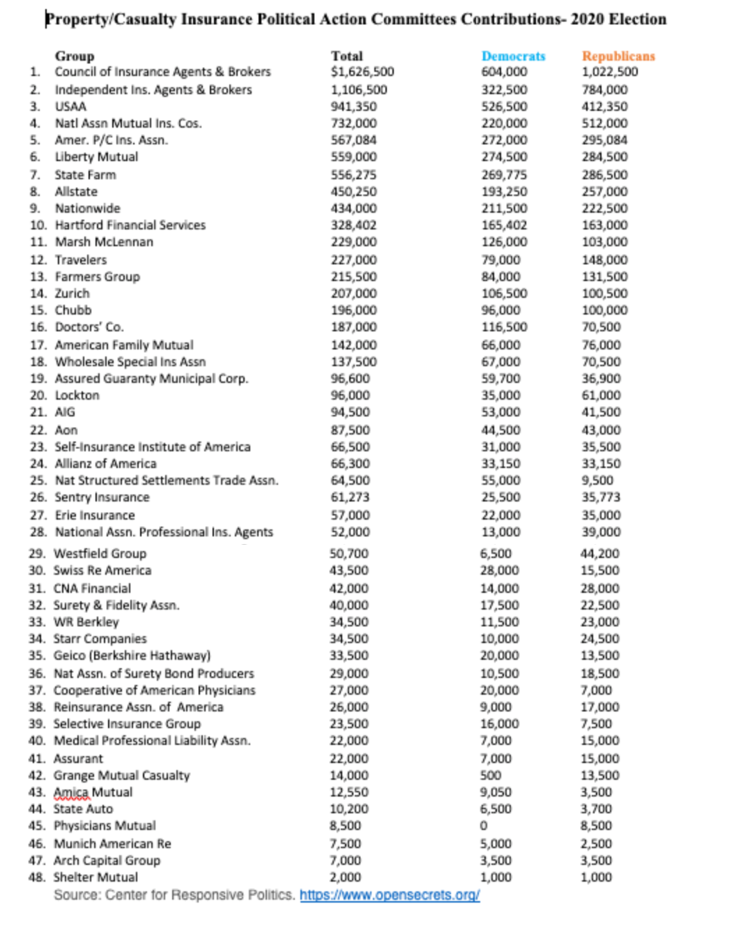 Ωστόσο, οι Ρεπουμπλικάνοι «νίκησαν» τους Δημοκρατικούς όσον αφορά το συνολικό ποσό της ασφαλιστικής βιομηχανίας προς τους υποψηφίους της Βουλής και της Γερουσίας. Από τα σχεδόν 25 εκατομμύρια δολάρια που έχουν συνεισφέρει μέχρι στιγμής οι ασφαλιστικές οι Ρεπουμπλικάνοι έχουν λάβει περίπου 54% και οι Δημοκρατικοί, 46%.