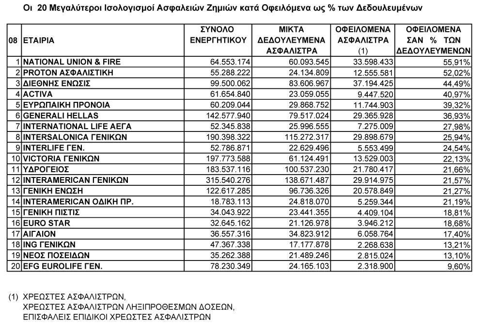 Σχετικά με τον πίνακα που αναφέρει τα Οφειλόμενα Ανείσπρακτα Ασφάλιστρα των Εταιρειών, έξι Εταιρείες παρουσιάζουν ποσοστά που υπερβαίνουν το 30% του συνόλου των εγγεγραμμένων Ασφαλίστρων τους. Αυτές είναι: η National Union με 55,91%, η Proton με 52,02%, η Διεθνής Ένωσις με 44,49%, η Activa με 40,97%, η Ευρωπαϊκή Πρόνοια με 39,32%, και η Generali με 36,93%!