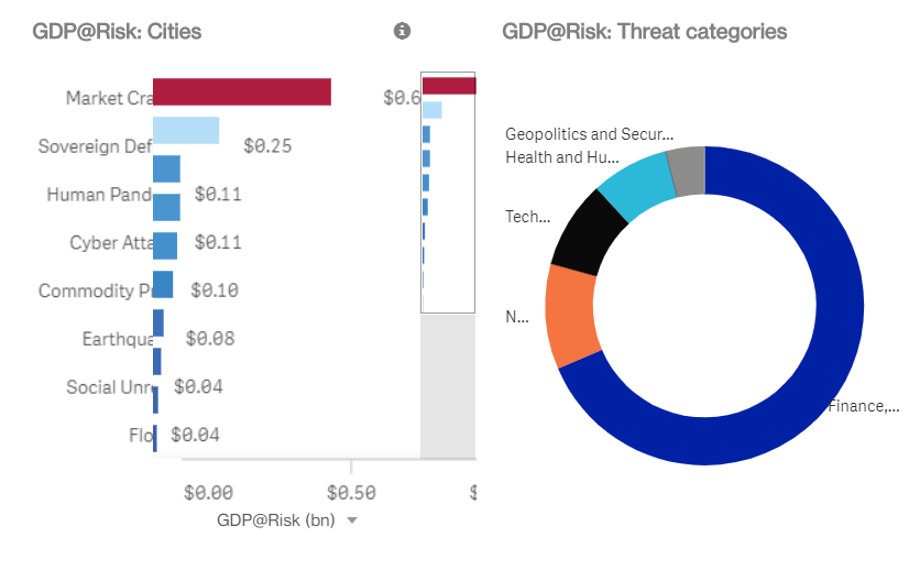 Σύμφωνα με τον εν λόγω δείκτη, που έρχεται να μετρήσει κινδύνους σε περισσότερες από 300 μεγαλουπόλεις παγκοσμίως, το ΑΕΠ της Αθήνας ανέρχεται σε 96,99 δις δολάρια και ο βασικότερος κίνδυνος είναι η κατάρρευση της αγοράς που μπορεί να οδηγήσει σε απώλειες 0,67 δις δολαρίων.