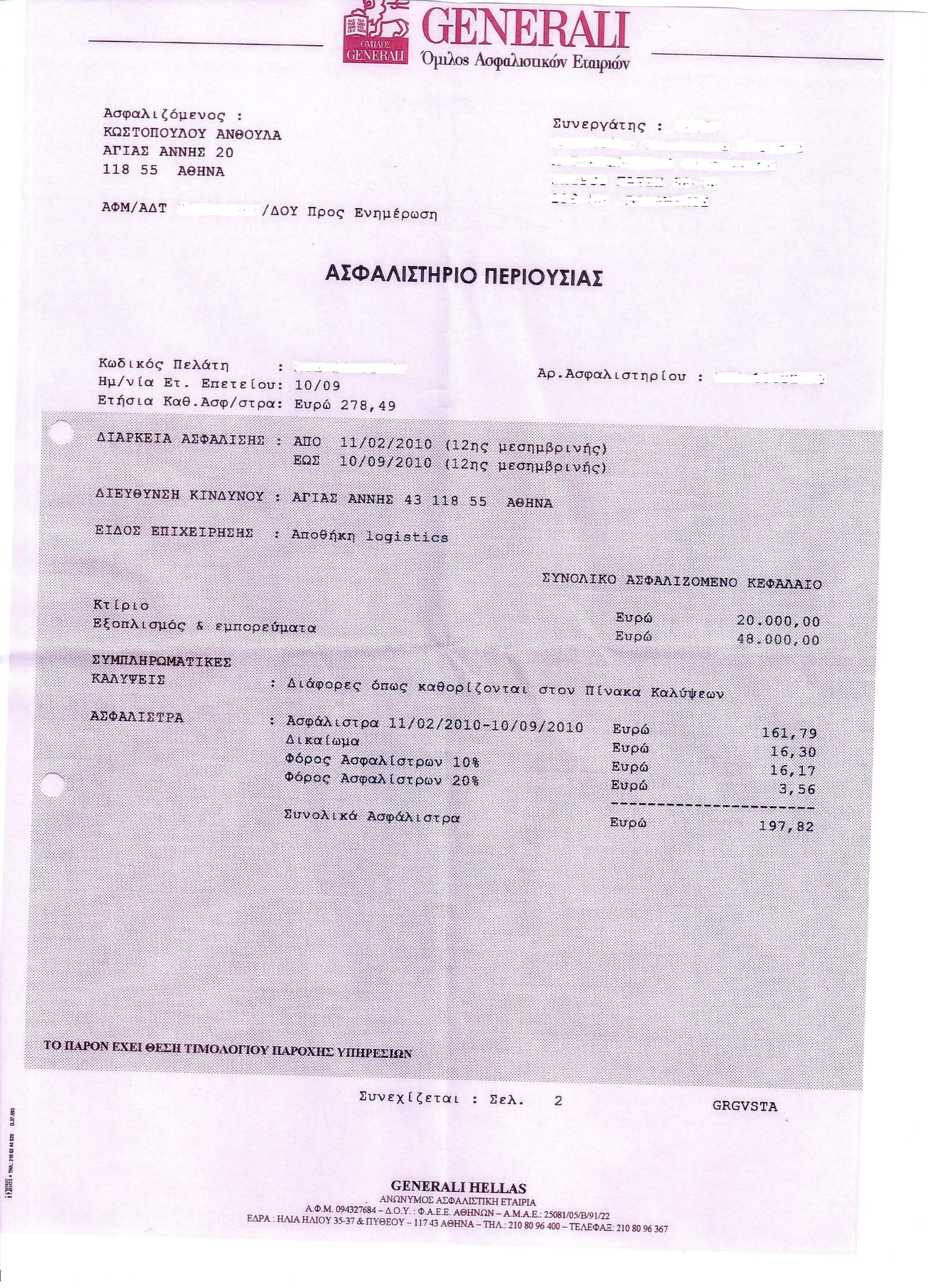 Όπως μας εξηγεί «Τον Απρίλιο του 2011 φωτιά που ξεκίνησε από άλλη αποθήκη κατέστρεψε ολοσχερώς τις αποθήκες της επιχείρησης, τα εμπορεύματα των πελατών και 4 οχήματα. Η ζημιά ήταν τεράστια και τα εμπορεύματα που κάηκαν πολλά γιατί ήταν παραμονές της πασχαλινής περιόδου. Στην Interamerican που κάλυπτε την εναπόθεση και εμπορεύματα σε έμφορτα οχήματα ήταν ασφαλισμένα 300.000 ευρώ, ενώ η Generali είχε ασφαλίσει τον εξοπλισμό, τις αποθήκες και εμπορεύματα που βρίσκονταν υπό το καθεστώς αποθήκευσης. Η φωτιά κατέστρεψε τα πάντα». Η μεταφορική επιχείρηση είχε συσταθεί από το σύζυγο της κ. Κωστοπούλου το 1975 και το 1986 ανέλαβε η ίδια τη διαχείρισή της. Ανέκαθεν όπως μας λέει είχαμε τα φορτηγά, τα εμπορεύματα και τις εγκαταστάσεις καλυμμένα με ιδιωτική ασφάλιση γιατί αυτό πιστεύαμε ότι έπρεπε να κάνουμε.