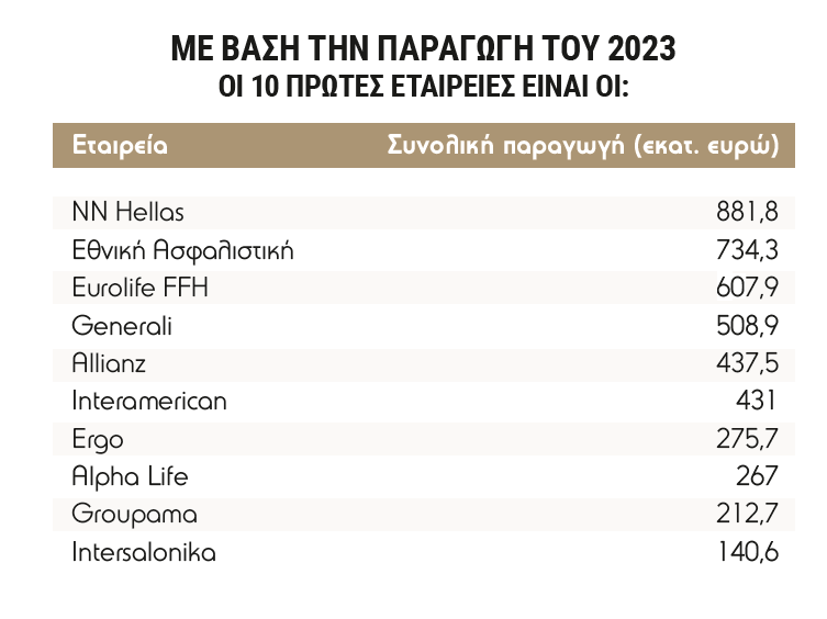 Παραγωγή 4,4 δισ. ευρώ συγκεντρώνουν οι 10 μεγαλύτερες σε παραγωγή ασφαλιστικές εταιρείες στην Ελλάδα, με τον κλάδο να συγκεντρώνει συνολικά μέσα στο 2023 5 δισ. ευρώ ασφάλιστρα. Στην πρώτη πεντάδα αποδίδεται περίπου το 60% της συνολικής παραγωγής του κλάδου, ενώ στις πρώτες 10 εταιρείες περίπου πάνω από το 83%.