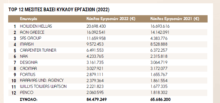 Στην κορυφή της κατάταξης είναι η Howden Hellas με κύκλο εργασιών που ανέρχεται σε 20,6 εκατ. ευρώ και ακολουθούν η Aon Greece, με 16 εκατ. ευρώ, η SRS με 11,6 εκατ. ευρώ, η Marsh με 9,5 εκατ. ευρώ, η Carpenter Turner με 6,4 εκατ. ευρώ, η NAK με 4,2 εκατ. ευρώ, η Designia με 3,1 εκατ. ευρώ, η Cromar με 3 εκατ. ευρώ, η Fortius με 2,8 εκατ. ευρώ, η Karavias με 2,3 εκατ. ευρώ, η Willys με 2,2 εκατ. ευρώ και η PENCO με 2 εκατ. ευρώ.