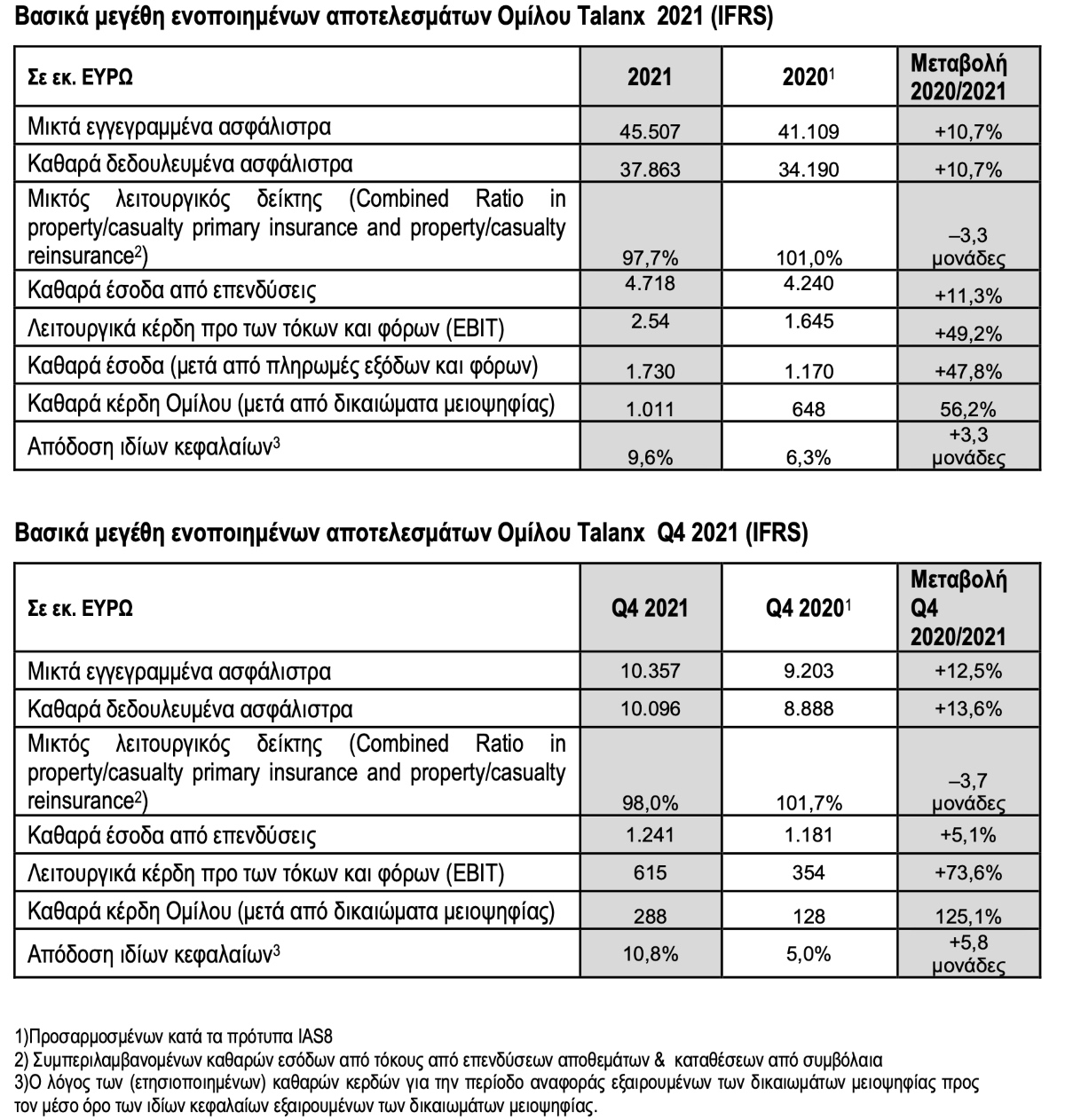 Οι φυσικές καταστροφές (235 εκ. ευρώ) και η πανδημία του κορωνοϊού (403 εκ. ευρώ) επηρέασαν τα λειτουργικά κέρδη κατά 638 εκ. ευρώ. Ωστόσο, τα λειτουργικά κέρδη εξακολούθησαν να αυξάνονται κατά 49% στα 2,5 Δις ευρώ (από 1,6) χάρη στα προγράμματα αναδιάρθρωσης στις πρωτασφαλίσεις και στη συνεχιζόμενη εξαιρετικά ισχυρή απόδοση των αντασφαλίσεων. Τα καθαρά έσοδα του Ομίλου αυξήθηκαν περισσότερο από 50% στα 1.011 εκ. ευρώ (από 648), υπερβαίνοντας το όριο του 1 Δις ευρώ ένα χρόνο νωρίτερα από ό,τι προβλεπόταν το 2018, όταν ο Όμιλος δημοσίευσε τους στρατηγικούς του στόχους για την περίοδο έως το 2022. Ο Όμιλος Talanx επιβεβαιώνει την πρόβλεψή του για το 2022, ό,τι τα καθαρά έσοδα του Ομίλου αναμένεται να κυμανθούν μεταξύ 1.050–1.150 εκατ. ευρώ. Το Διοικητικό και το Εποπτικό Συμβούλιο προτείνουν στη Γενική Συνέλευση την αύξηση του μερίσματος κατά 10 σεντς ανά μετοχή, δηλαδή στα 1,60 ευρώ ανά μετοχή.
