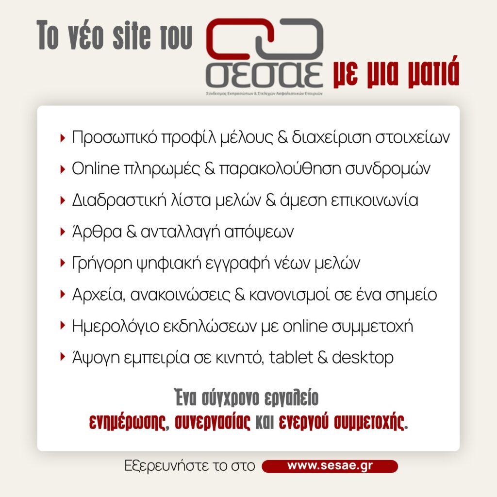 Το νέο site αποτελεί ένα σημαντικό εργαλείο για την επίτευξη των στόχων του Συνδέσμου. Δεν είναι απλώς μια νέα πλατφόρμα, αλλά ένα ζωντανό εργαλείο διασύνδεσης, εξυπηρέτησης και διαρκούς στήριξης των μελών. Ο ΣΕΣΑΕ εξελίσσεται και ανταποκρίνεται στις πραγματικές ανάγκες της εποχής και των ανθρώπων του κλάδου.