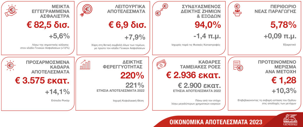 - Ρεκόρ Λειτουργικών Αποτελεσμάτων που έφτασαν στα €6,9 δισ. (+7,9%), χάρη στη θετική συμβολή όλων των τομέων, με πρώτο τον κλάδο Γενικών Ασφαλίσεων. Ο Συνδυασμένος Δείκτης Ζημιών και Εξόδων παρουσίασε βελτίωση φθάνοντας το 94,0% (-1,4 π.μ.). π.μ.). Το Περιθώριο Νέας Παραγωγής παρουσίασε εξαιρετική απόδοση φτάνοντας στο 5,78% (+0,09 π.μ.)