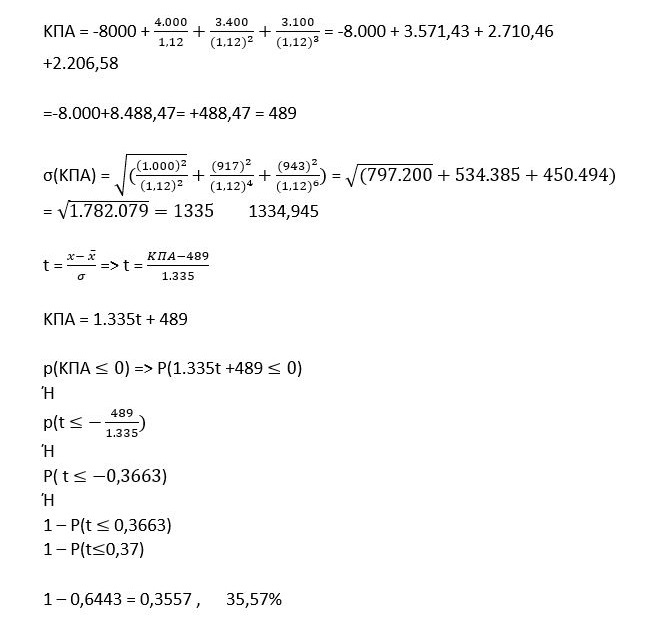 - Υπολογίστε την πιθανότητα ώστε το επενδυτικό έργο να έχει μια ΚΠΑ αρνητική ή ίση με μηδέν. Η ΚΠΑ ακολουθεί την κανονική κατανομή.