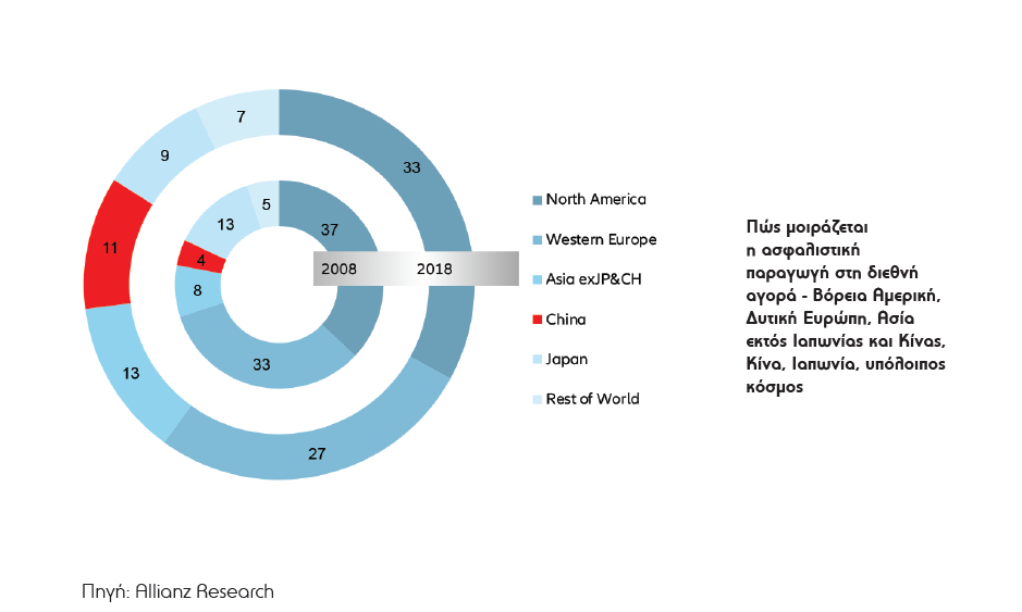 Το μερίδιο της Κίνας στα διεθνή ασφάλιστρα θα διαμορφωθεί στο 21% από 11%, ενώ η Δυτική Ευρώπη θα απολέσει μέσα στα δέκα αυτά χρόνια μέρος της παραγωγής της και από 27% μερίδιο θα μεταβεί στο 22%.