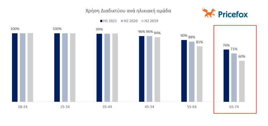 Το 94% των Ελλήνων είναι ενεργοί χρήστες του διαδικτύου. Παρόλο που οι Έλληνες μέχρι 44 ετών είναι όλοι χρήστες του διαδικτύου, η πανδημία έχει επιταχύνει την διείσδυση μεγαλύτερων ηλικιακών ομάδων στο διαδίκτυο με το 76% της ηλικιακής ομάδας 65-74 να είναι πλέον ενεργοί χρήστες του διαδικτύου, αύξηση που φτάνει το 23% τα τελευταία 2 χρόνια.