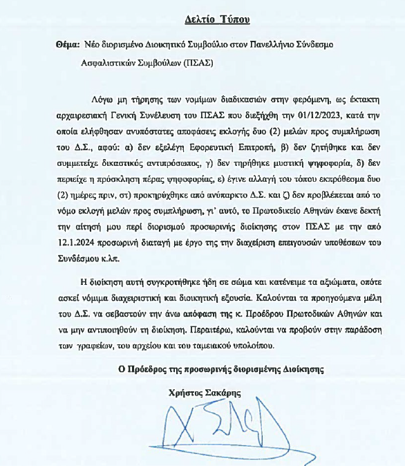 Δεκτή έκανε το Πρωτοδικείο Αθηνών αίτηση του κ. Χ. Σακάρη περί διορισμού προσωρινής διοίκησης στον ΠΣΑΣ. Ειδικότερα σε σχετική επιστολή αναφέρονται τα ακόλουθα:
