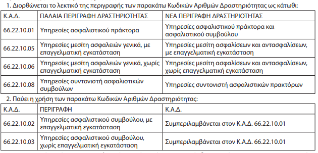 Για τις επιχειρήσεις όπου στο φορολογικό Μητρώο υπάρχουν ενεργές δραστηριότητες με τους ΚΑΔ των οποίων παύει η χρήση, θα γίνει αντιστοίχιση με κεντρικές διαδικασίες, διακοπή και έναρξη της δραστηριότητας 66.22.10.01, χωρίς ενέργεια των φορολογουμένων