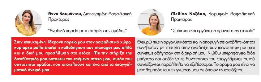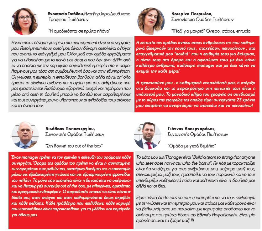 Διαπνέονται από πνεύμα αλληλοϋποστήριξης, διαχείριση κορυφαίων επιδόσεων, με πίστη και όραμα αναπόσπαστα δίπλα στους ασφαλισμένους τους. Κύριοι συντελεστές είναι οι κορυφαίοι managers του γραφείου οι οποίοι στέκονται συνεχώς δίπλα στους συνεργάτες τους, παρέχοντας τους διαρκή εκπαίδευση, άνοιγμα νέων αγορών, τεχνογνωσία.