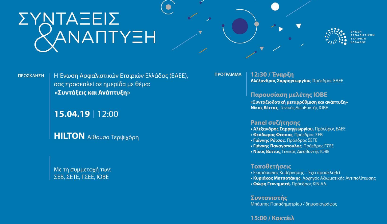Η Ένωση Ασφαλιστικών Εταιριών Ελλάδος (ΕΑΕΕ) διοργανώνει ημερίδα με θέμα: «Συντάξεις & Ανάπτυξη», τη Δευτέρα 15 Απριλίου 2019 στις 12.00 μ.μ. στην αίθουσα Τερψιχόρη του Ξενοδοχείου Hilton, με τη συμμετοχή των ΣΕΒ, ΣΕΤΕ, ΓΣΕΕ και ΙΟΒΕ.