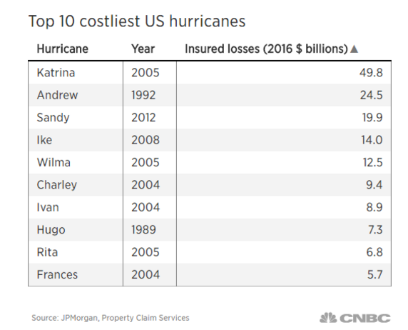 Αν και στις διεθνείς αγορές επικρατεί ένας εφησυχασμός από την αποψη ότι η καταστροφές που θα άφηνε πίσω του ο τυφώνας Irma αναμένονταν πιο κοστοβόρες, ωστόσο η JP Morgan ήδη κατατάσσει την Irma στη λίστα μες τις πέντε πιο κοστοβόρες φυσικές καταστροφές.