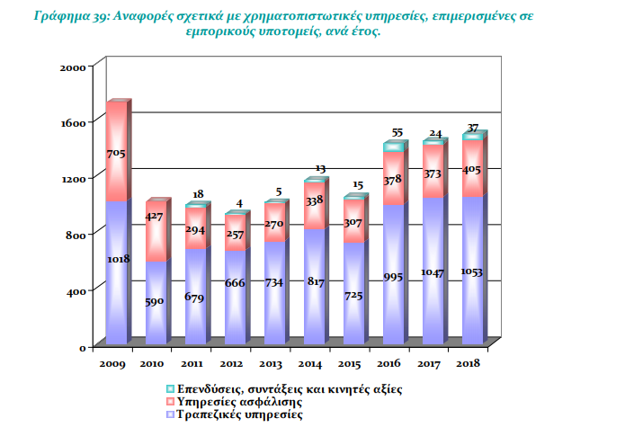 Ειδικότερα το 2018 οι αναφορές για χρηματοπιστωτικές υπηρεσίες ήταν το 14,9% επί του συνόλου και ανήλθαν σε 1.495. Από αυτές οι 405 αφορούσαν ασφαλιστήρια συμβόλαια και πιο συγκεκριμένα: