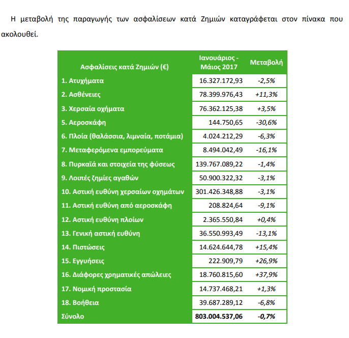Αντιστοίχως, οι ασφαλίσεις κατά Ζημιών αύξησαν επίσης την παραγωγή τους σε μηνιαία βάση (+2,5%). Συνολικά, η παραγωγή ασφαλίστρων μηνός Μαΐου αυξήθηκε κατά 3,0% έναντι του Μαΐου του 2016.