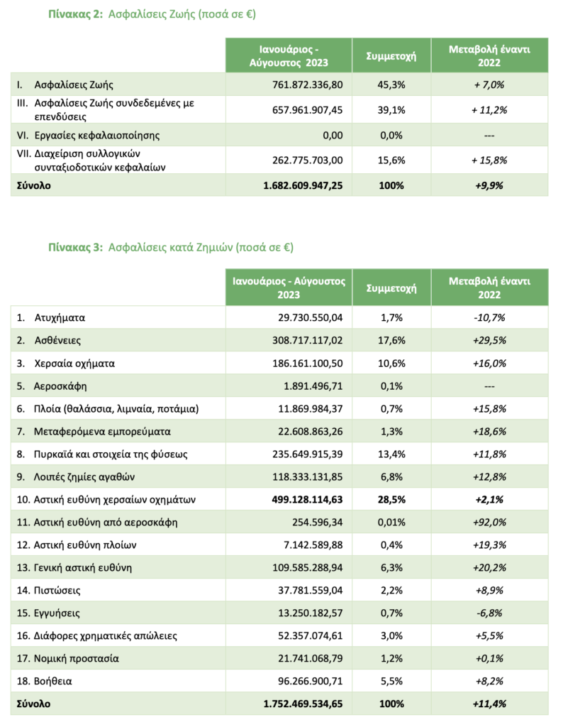 Σύμφωνα με τα στοιχεία αυτά (κατόπιν προσαρμογής των δεδομένων του προηγούμενου χρονικού διαστήματος με νεότερες απαντήσεις), από τη σύγκριση των δηλώσεων παραγωγής ασφαλίστρων των μηνών Ιανουαρίου – Αυγούστου 2023 των ανωτέρω επιχειρήσεων με τις αντίστοιχες της ίδιας περιόδου για το 2022 των ιδίων επιχειρήσεων, προκύπτουν τα παρακάτω: