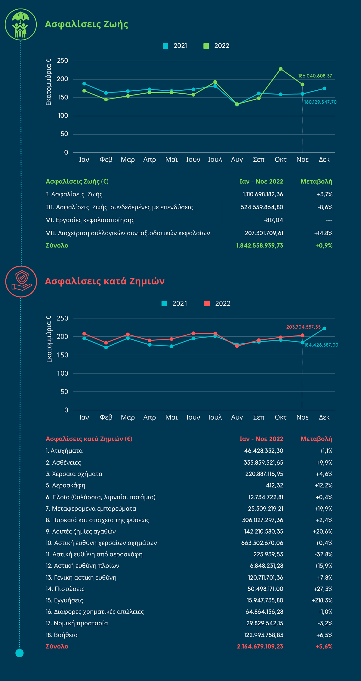 Με θετικό πρόσημο και αύξηση της τάξεως του 3,4% κινήθηκαν οι ασφαλίσεις στην περίοδο Ιανουαρίου – Νοεμβρίου 2022, σύμφωνα με τα στοιχεία της ΕΑΕΕ.