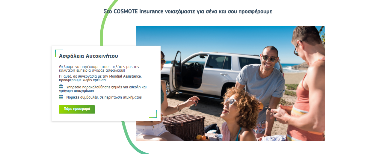Ενεργή για τους χρήστες του διαδικτύου είναι η πλατφόρμα Online ασφαλίσεων της Cosmote, που παρέχει ασφαλίσεις αυτοκινήτου, κατοικίας και υγείας. Πρόκειται για μία εξέλιξη που θα εντείνει τον ανταγωνισμό στην ασφαλιστική αγορά.