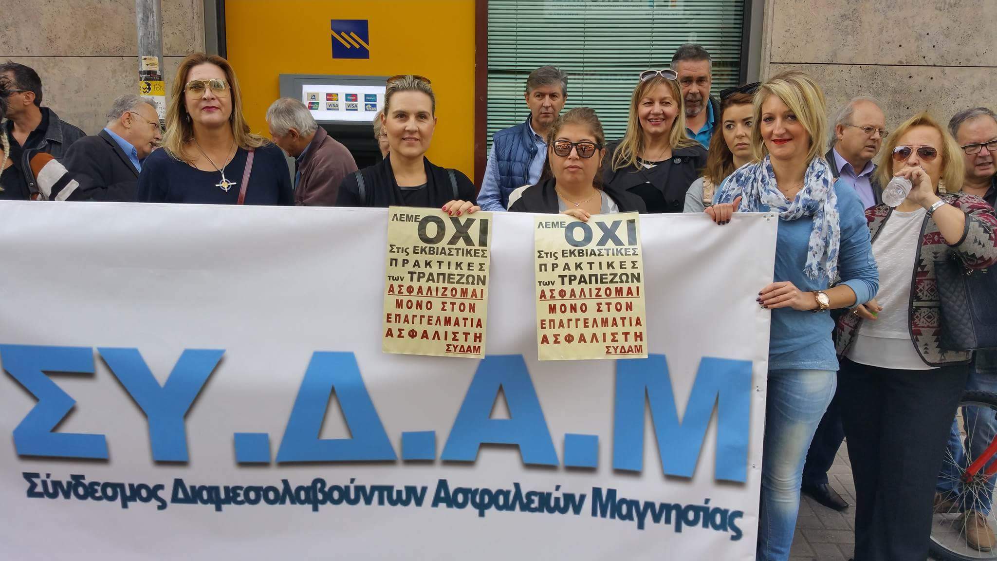 Μαζική ήταν η κινητοποίηση Ασφαλιστικών Διαμεσολαβητών σε όλη την Ελλάδα καθώς ομάδες Ασφαλιστών σε περισσότερες από 18 πόλεις διαδήλωσαν συμβολικά έξω από υποκαταστήματα Τραπεζών διαμαρτυρόμενοι για τις αθέμιτες πρακτικές που χρησιμοποιούν όσον αφορά την Ασφαλιστική τους δραστηριότητα.