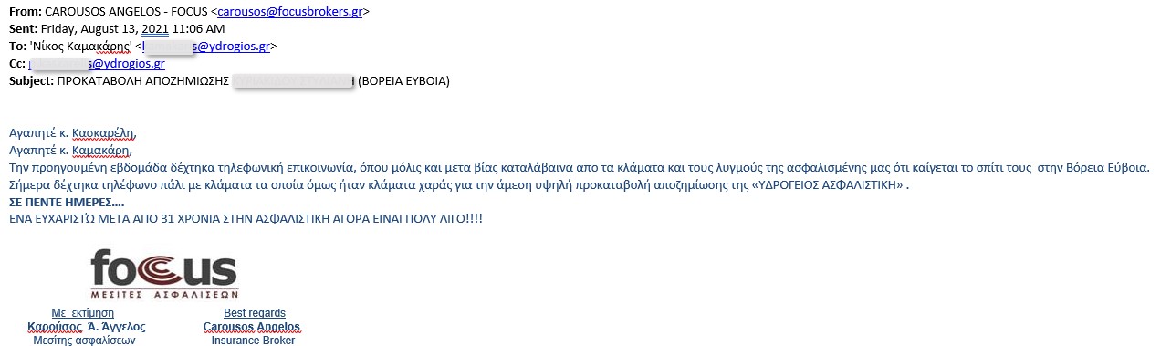 Η σημασία του θεσμού της ιδιωτικής ασφάλισης περικλείεται σε ευχαριστήρια επιστολή που έλαβε η Υδρόγειος Ασφαλιστική στα μέσα Αυγούστου από το συνεργάτη της, Α. Καρούσο στην focus brokers.