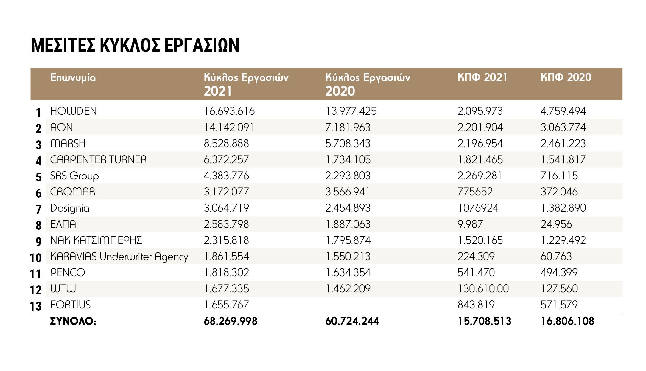 13 που δραστηριοποιούνται στην μεσιτεία ασφαλίσεων συγκαταλέγονται στη λίστα των κορυφαίων γραφείων διαμεσολάβησης στη λίστα top 40 “Μεσίτες και Πράκτορες”.