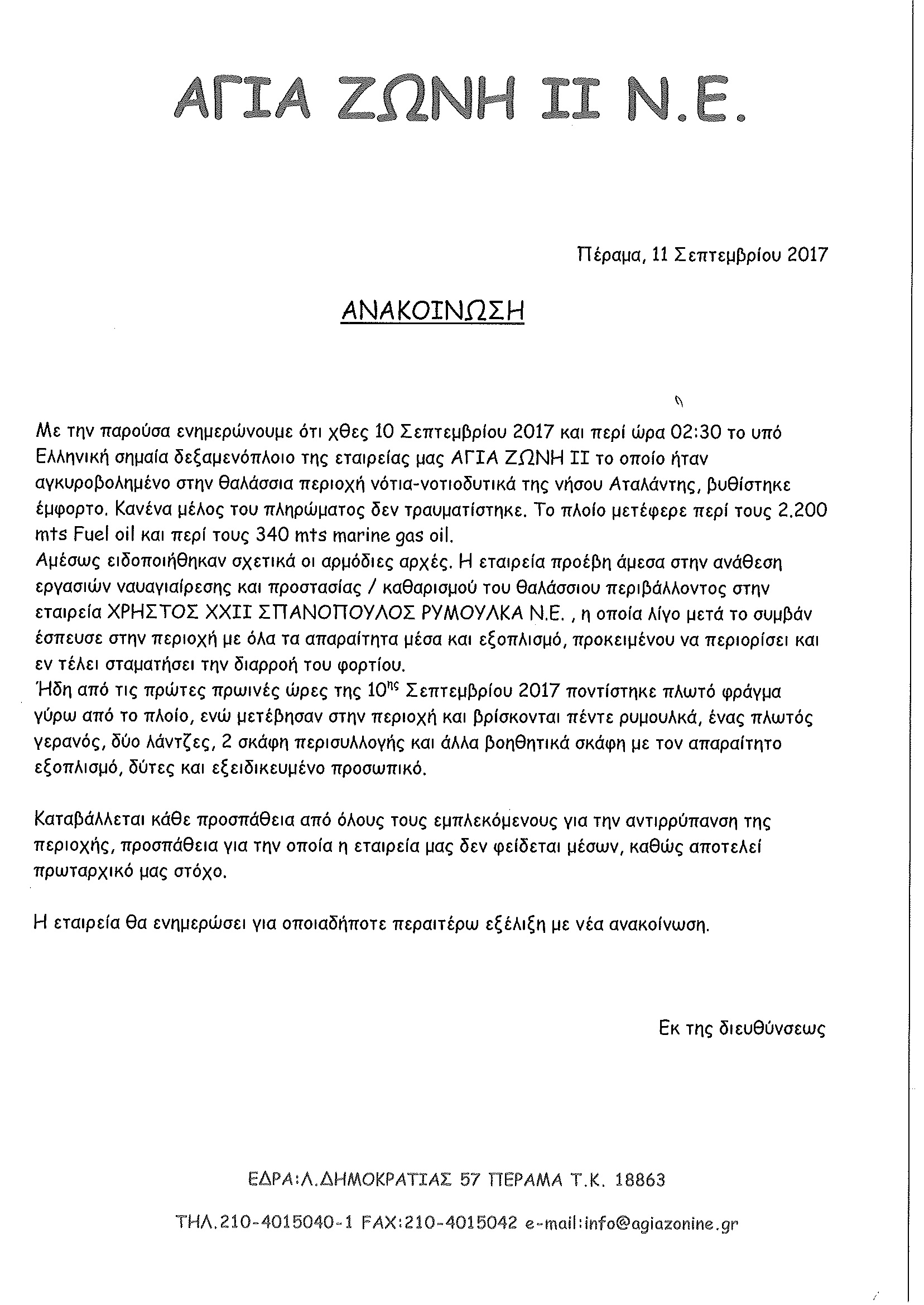Τεράστια και αναπάντητα ερωτηματικά δημιουργεί η βύθιση του μικρού Δ/Ξ «ΑΓΙΑ ΖΩΝΗ ΙΙ» της Ναυτιλιακής εταιρίας του Θ. Κουντούρη το οποίο ήταν αγκυροβολημένο στο Βόρειο τμήμα του αγκυροβολίου Πειραιά. Το πλοίο απέπλευσε έμφορτο τις πρωινές ώρες της 10/9/2017 από τα διυλιστήρια Ασπροπύργου (ΕΛΠΕ) μεταφέροντας 2.200 μετρικούς τόνους fuel oil και 370 μετρικούς τόνους marine gas oil. Στο πλοίο φέρονται να επέβαιναν 2 μέλη του πληρώματος σε σύνολο 11….. Οι δύο Ναυτικοί που επέβαιναν στο πλοίο διασώθηκαν την τελευταία στιγμή από ρυμουλκό που είχε προσεγγίσει την περιοχή βύθισης του πλοίου.