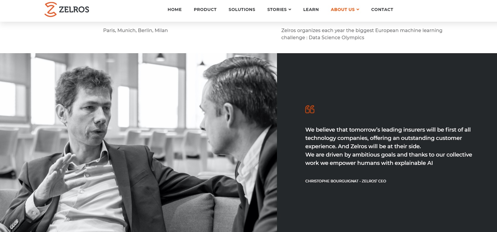 H Zelros είναι μια γαλλική startup που δημιουργήθηκε το 2016, έχει συγκεντρώσει κεφάλαια άνω των 4,5 εκατ. ευρώ και το Moto της είναι “ΑΙ for thw next generation augmented insurers”. Έχει γραφεία σε Γαλλία, Ιταλία και Γερμανία και παρέχει λογισμικό τόσο σε ασφαλιστικές όσο και σε μεσίτες και πράκτορες.