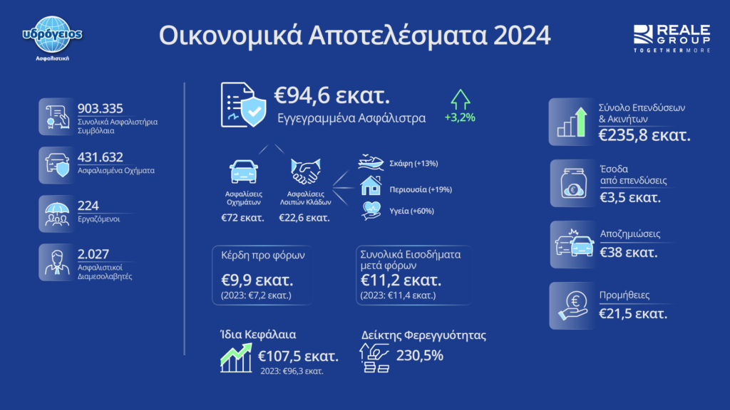 Στο πεδίο των επιδόσεων, η Υδρόγειος Ασφαλιστική κινήθηκε αναπτυξιακά, με αύξηση της συνολικής παραγωγής εγγεγραμμένων ασφαλίστρων κατά 3,2%, φτάνοντας τα €94,6 εκατ. έναντι €91,7 εκατ. το 2023.